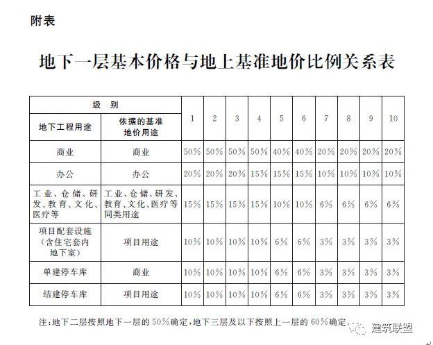 地下一层基本价格以基准地价为依据,按照与同类用途、相应级别地上建设用地使用权基准地价的一定比例确定(详见附表)。地下二层按照地下一层的50%确定,地下三层及以下按照上一层的60%确定。
